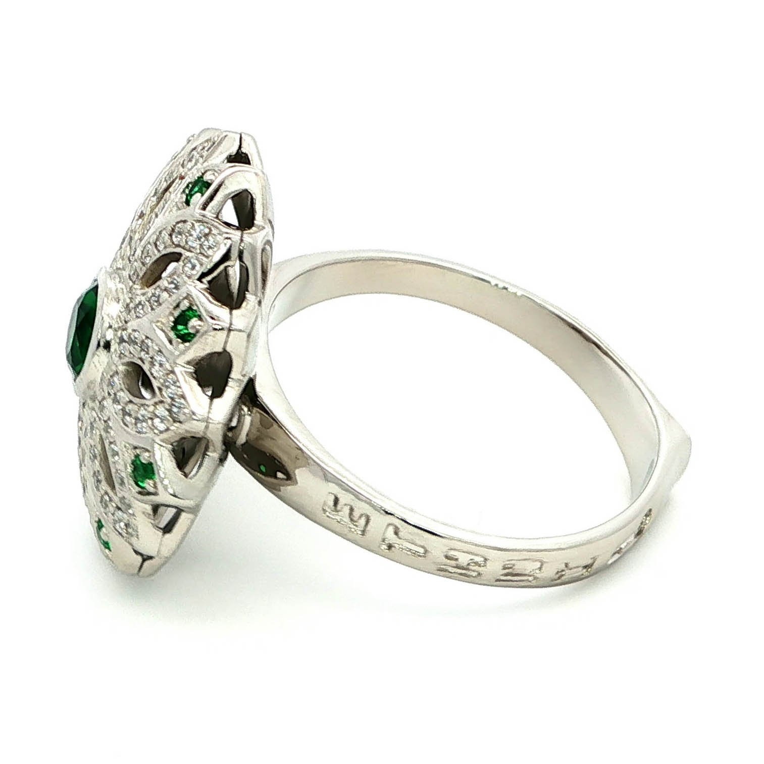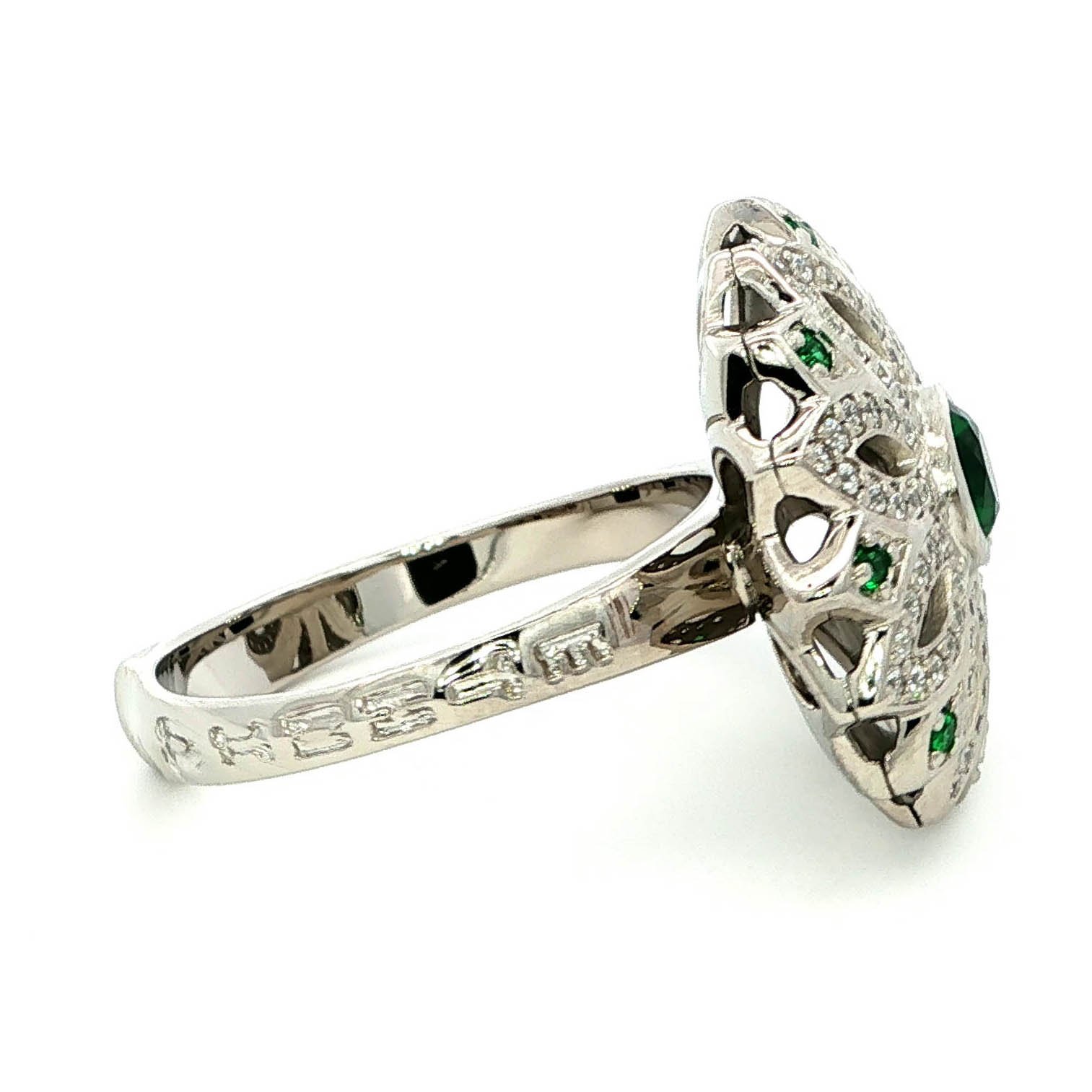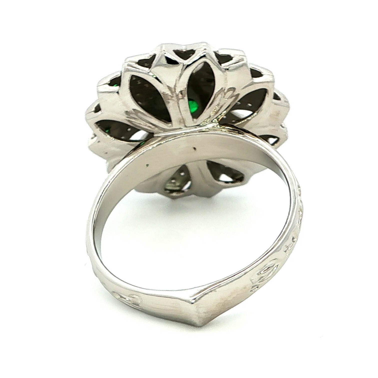 Elevate your style with this exquisite cocktail ring, crafted in lustrous white gold plating. The Motif-inspired design features a captivating round cabochon emerald at its center, surrounded by a halo of shimmering stones. This ring is a statement piece that embodies elegance and sophistication.