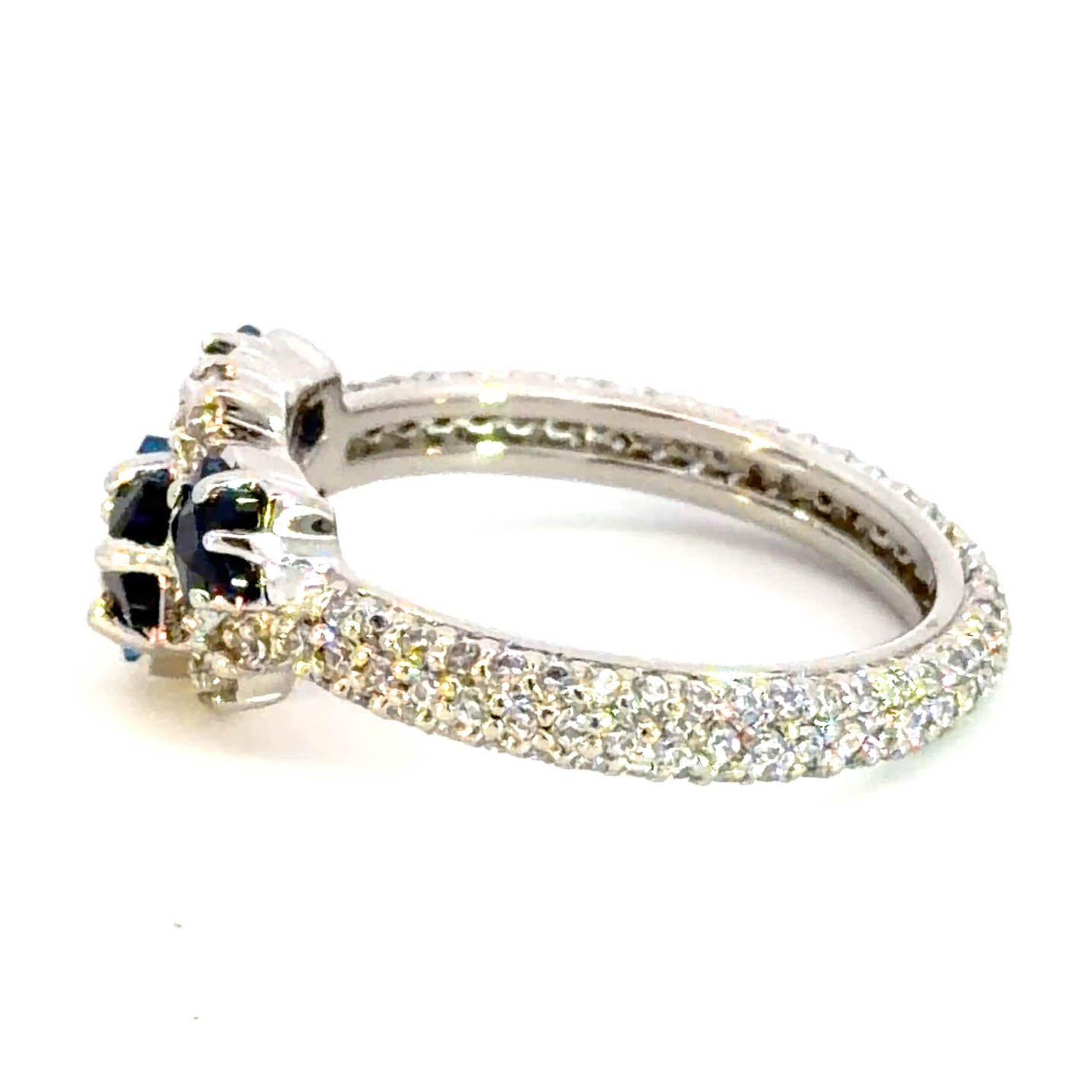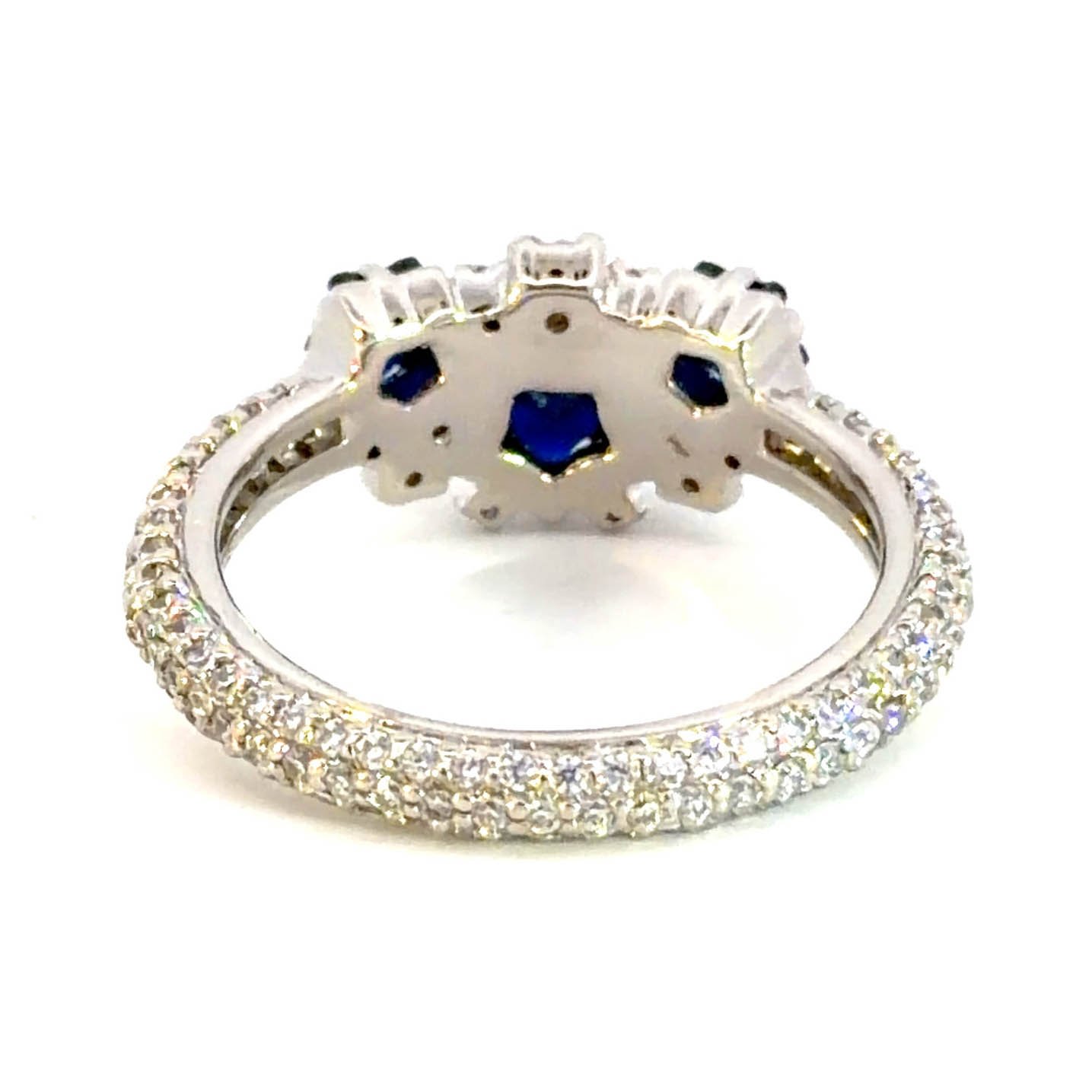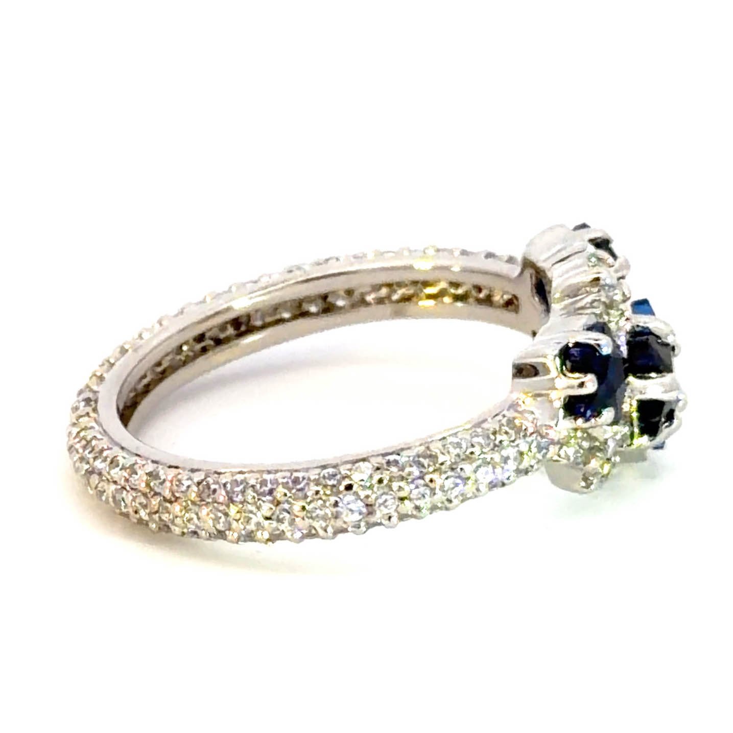 Indulge in the celestial allure of this sterling silver multi-stone ring. The centerpiece features deep blue, star-shaped sapphires with a cabochon cut, complemented by sparkling accents. The stones are set in a detailed arrangement, exuding a sense of refined elegance, with a transparent clarity and good polish. A captivating addition to any jewelry collection.