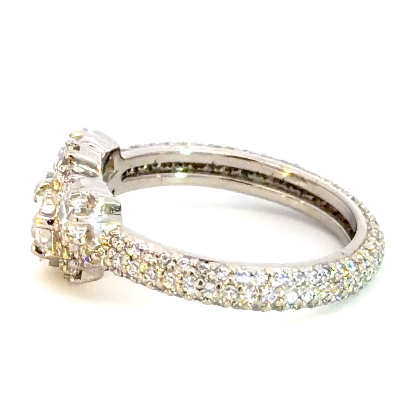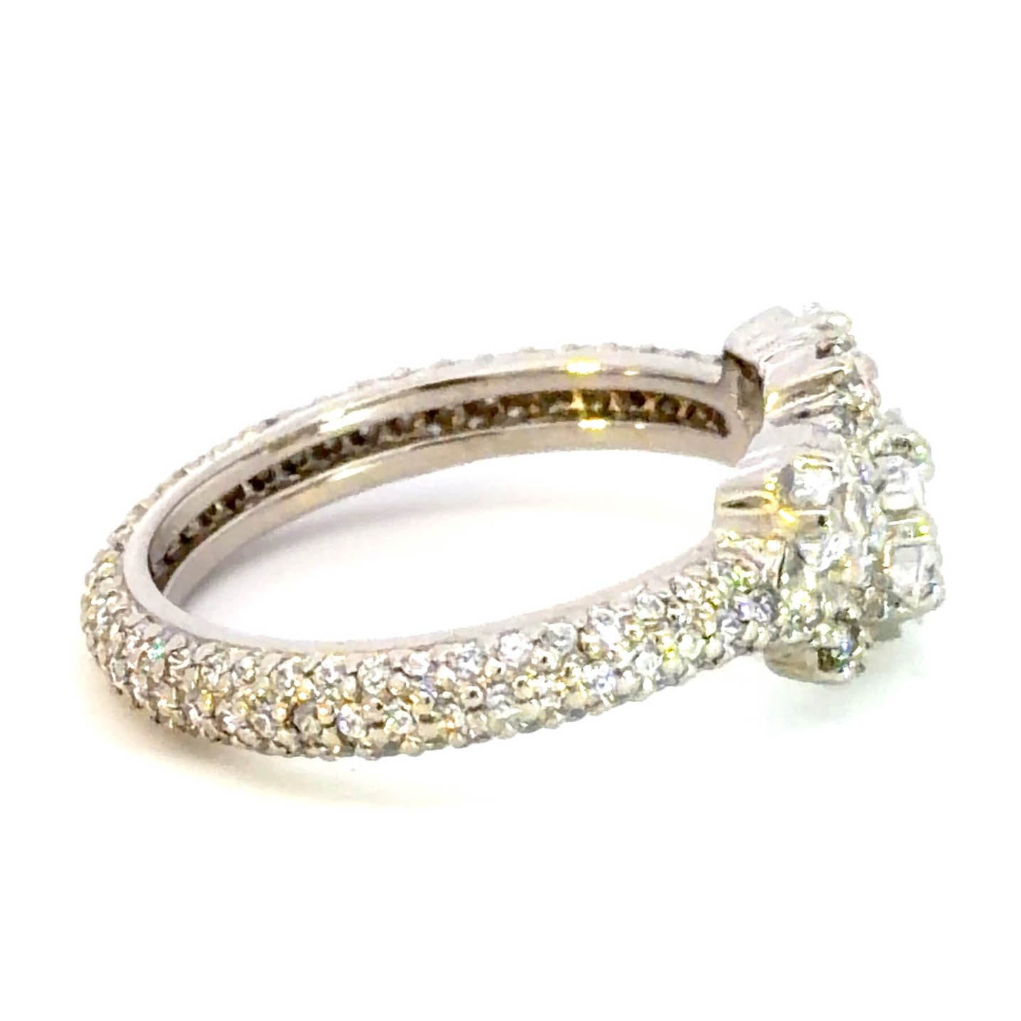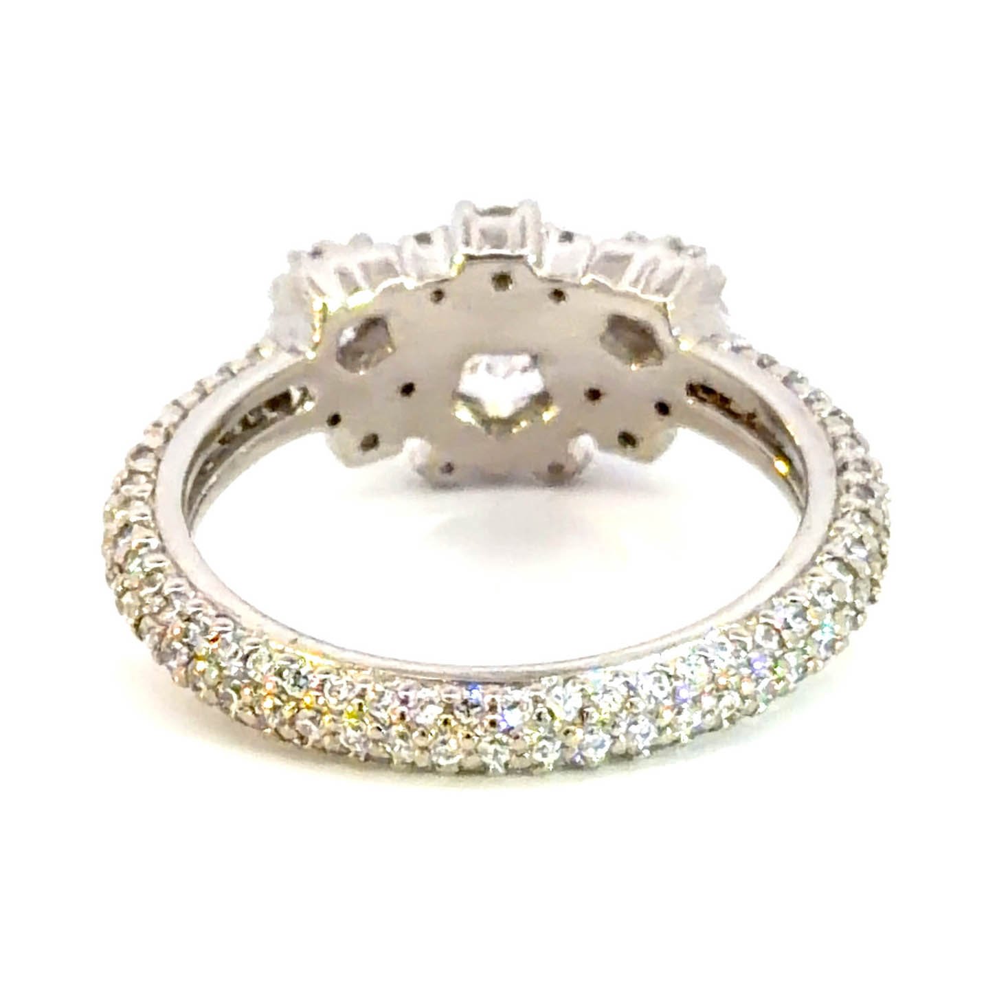 Exquisite multistone ring, meticulously crafted in platinum and adorned with a brilliant arrangement of round cut diamonds. The classic white gold setting enhances the fire and scintillation of each diamond, creating a mesmerizing display of light and luxury. A timeless testament to enduring style.