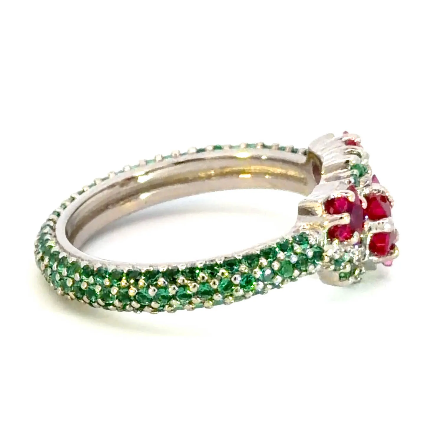This exquisite multi-stone ring features a star-shaped ruby as its focal point. The fiery ruby, with a brilliant cut, is set in a sterling silver band accentuated with a delicate array of emeralds and diamonds. This ring captures attention with its blend of gemstones and elegant design.