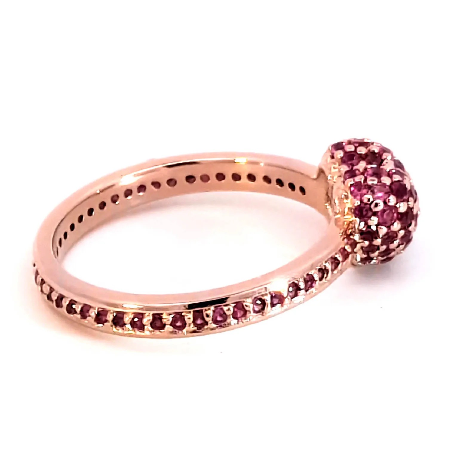 Embrace the allure of this rose gold multistone ring. The design features a heart motif, pavé-set with round, brilliant-cut rubies displaying a captivating reddish purple hue. Crafted in a warm rose gold setting, the meticulous craftsmanship and brilliant design makes this ring a timeless statement piece, perfect for adding a touch of elegance to any ensemble.