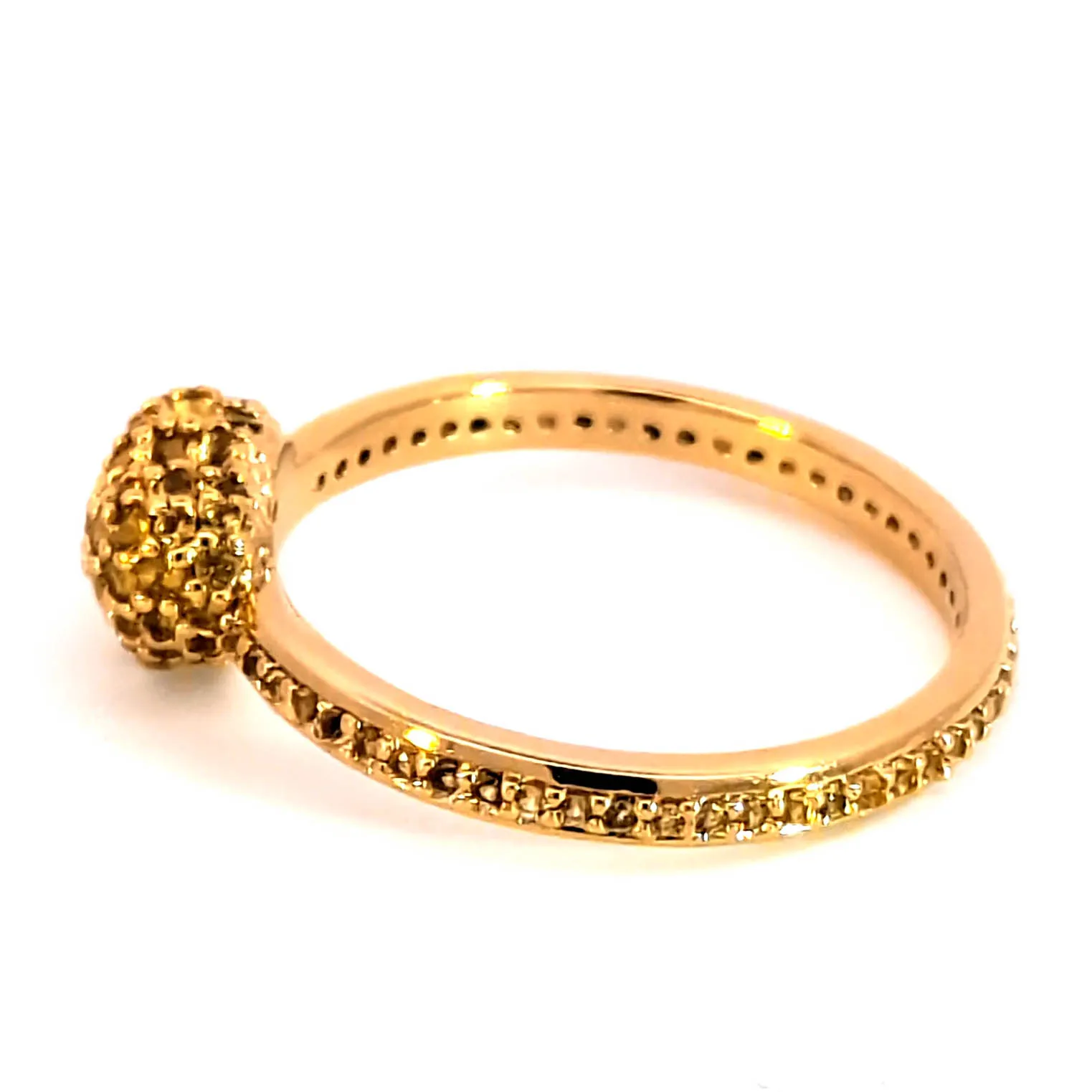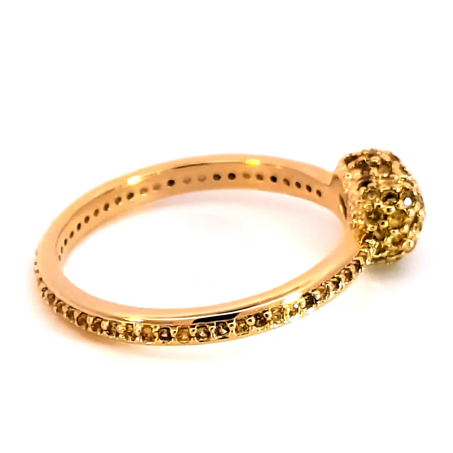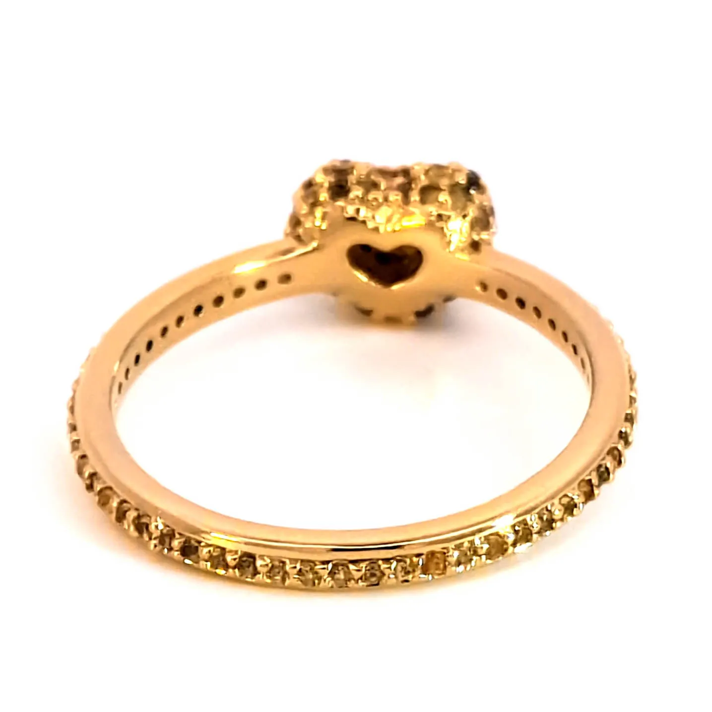 Exquisite yellow gold ring featuring a heart-shaped cluster of round-cut citrine gemstones. The bright, sunny yellow of the citrine complements the warm yellow gold of the band. This multistone ring is a perfect statement piece for those who love colorful gemstone jewelry. The stones are meticulously arranged, providing brilliance and visual appeal.