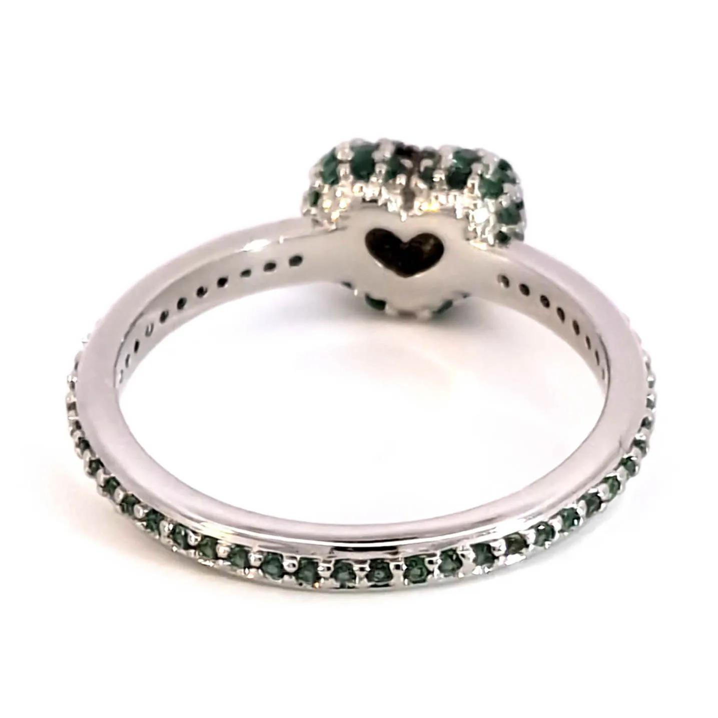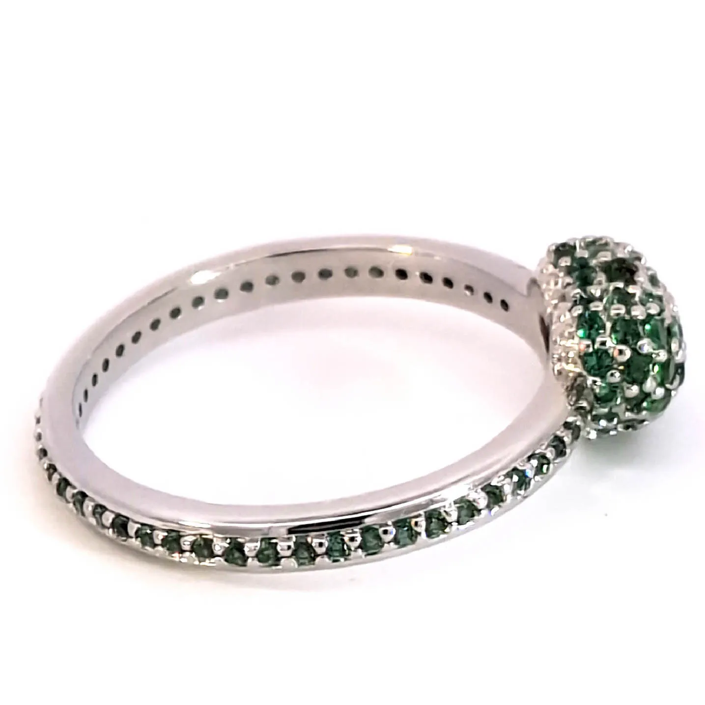 Exquisite multistone ring crafted in lustrous white gold plated silver for kids. Showcasing a captivating array of round brilliant cut emeralds, this ring exudes timeless elegance. The verdant green of the emeralds contrasts beautifully with the polished silver setting, creating a harmonious and sophisticated design. A mesmerizing piece to adorn any occasion.