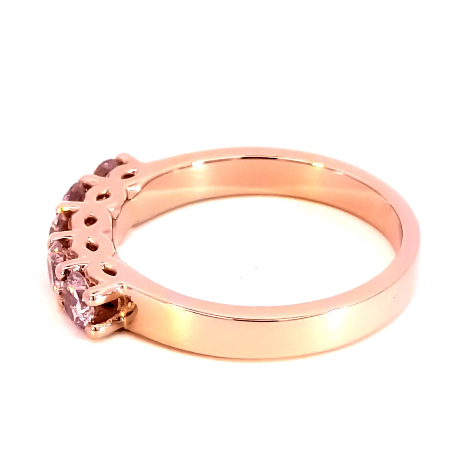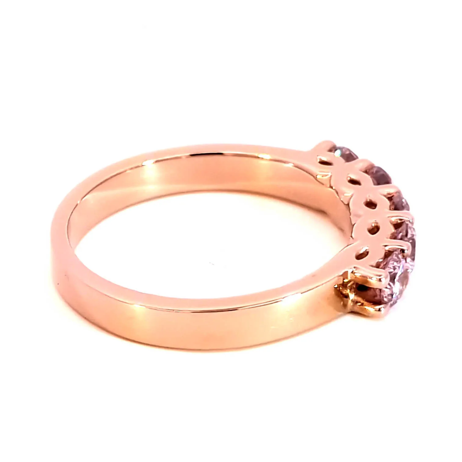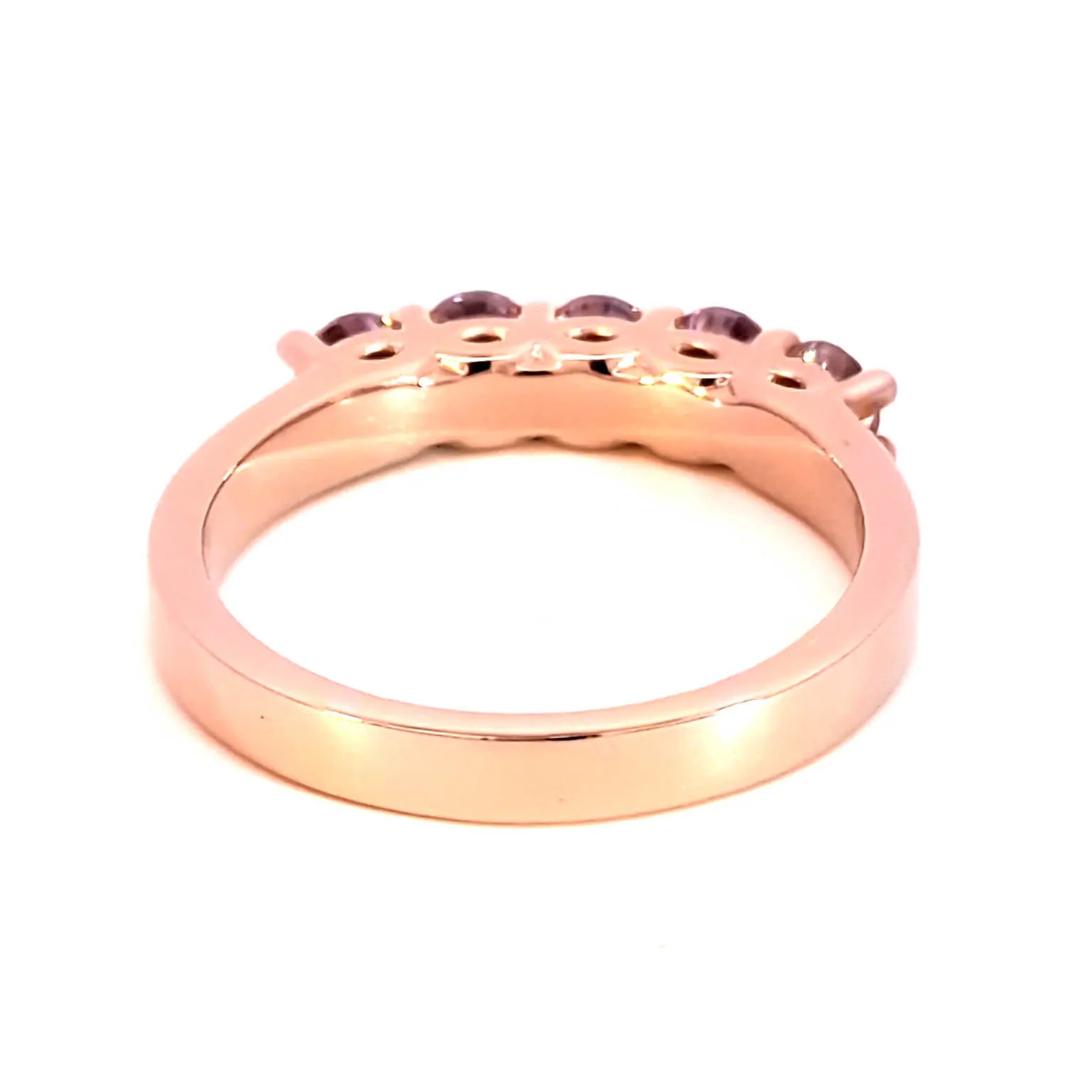 Elevate your style with this exquisite five-stones ring, crafted in radiant rose gold. The ring features a series of round cut, brilliant rose quartz gemstones displaying a reddish purple hue. The gemstones are transparent with VS clarity and polished to perfection. A unique addition to your fine jewelry collection.