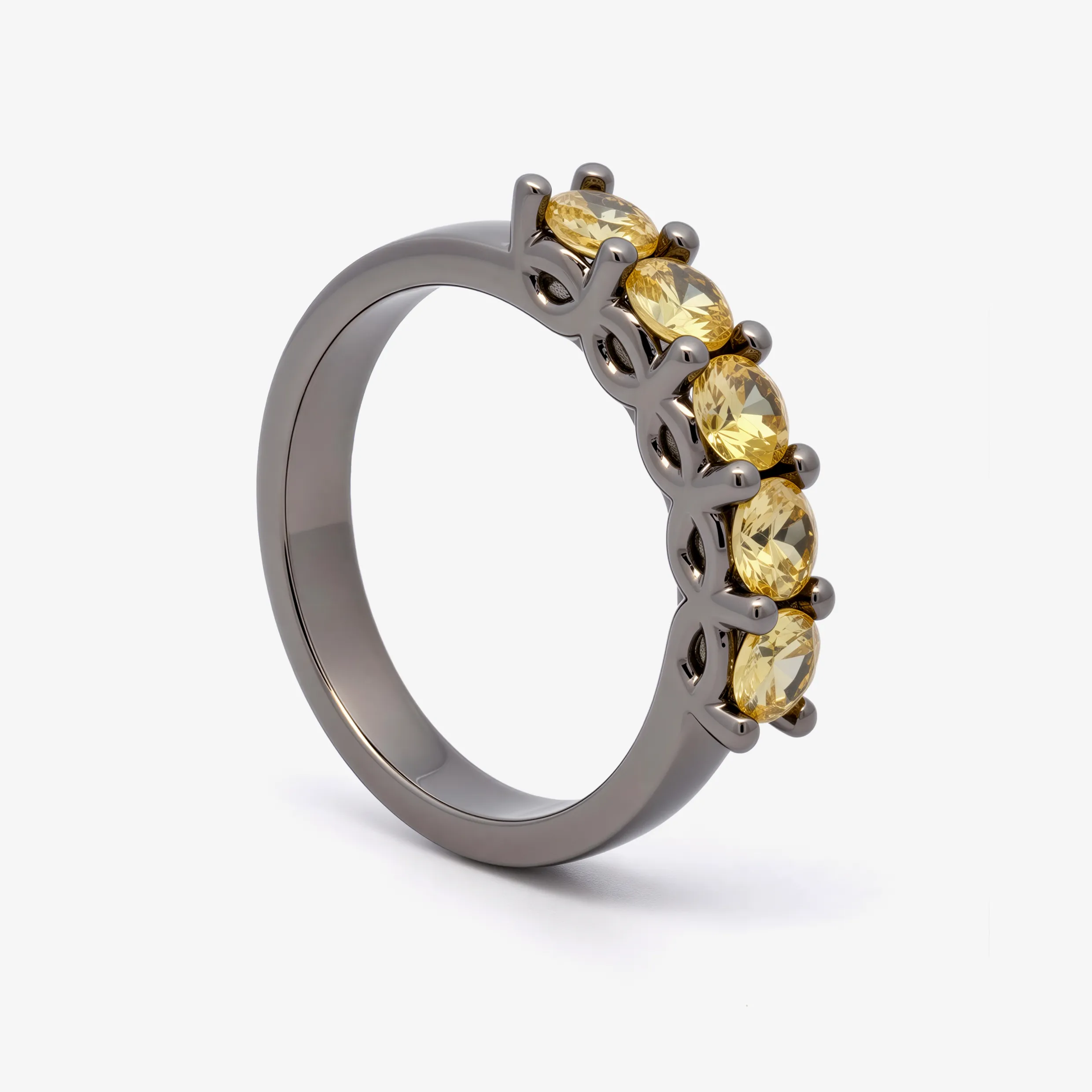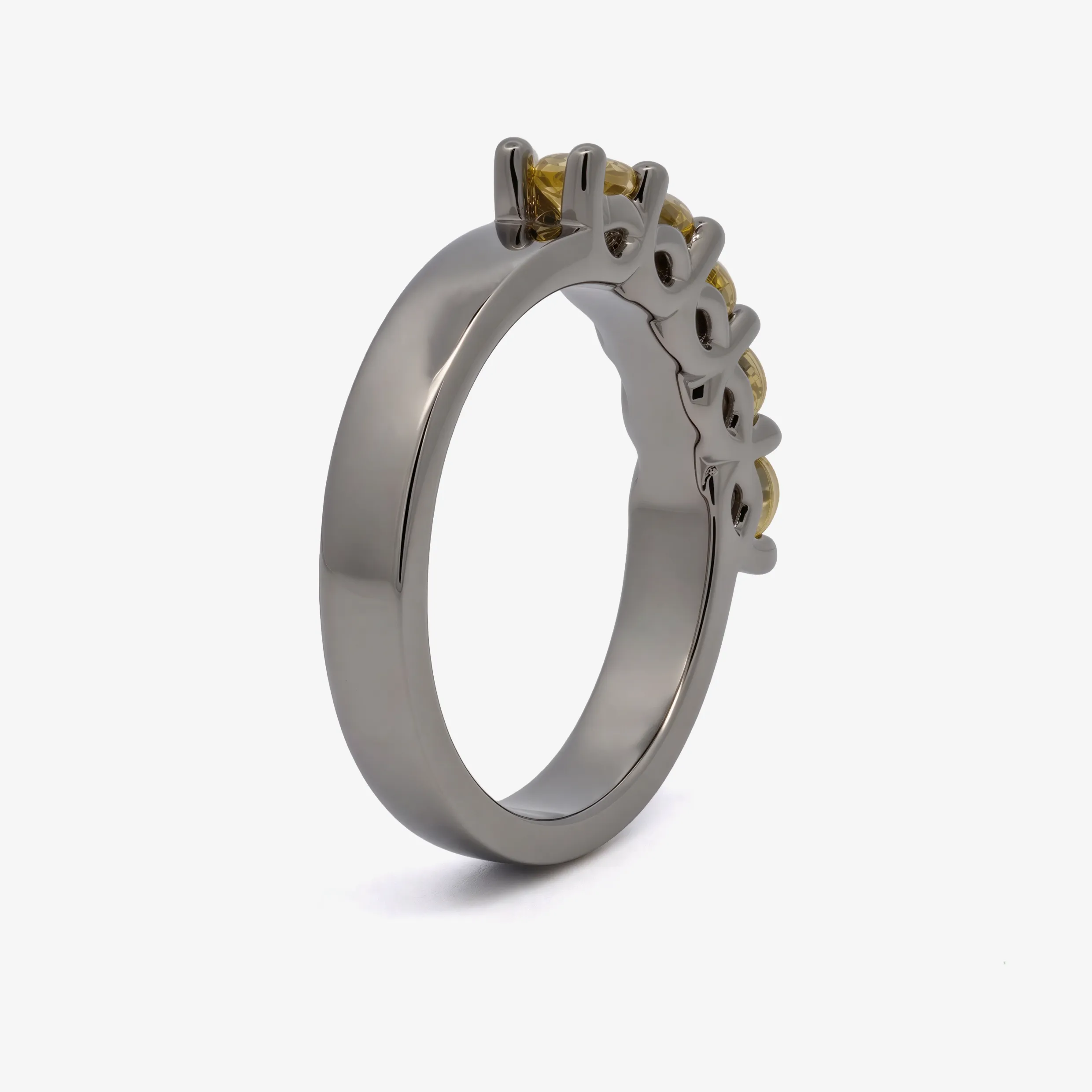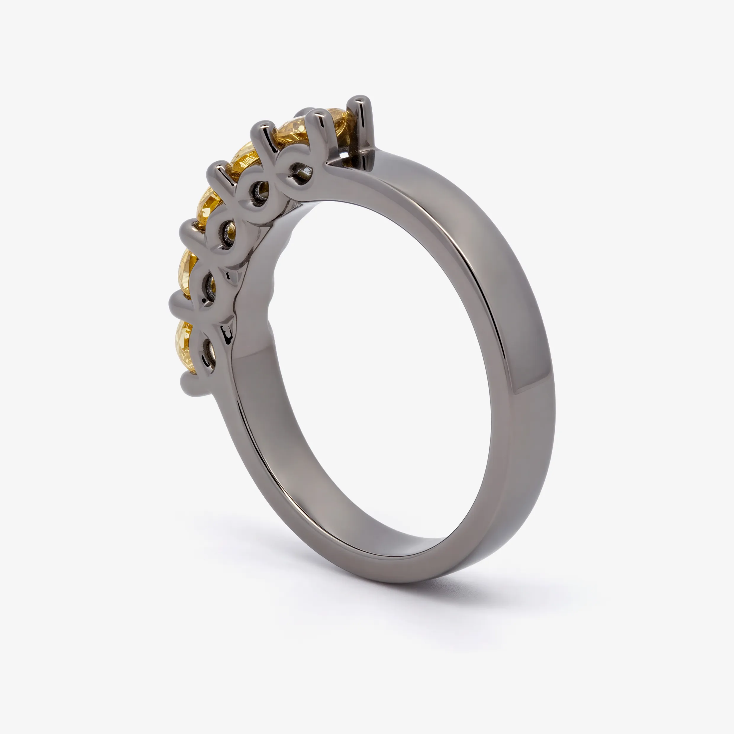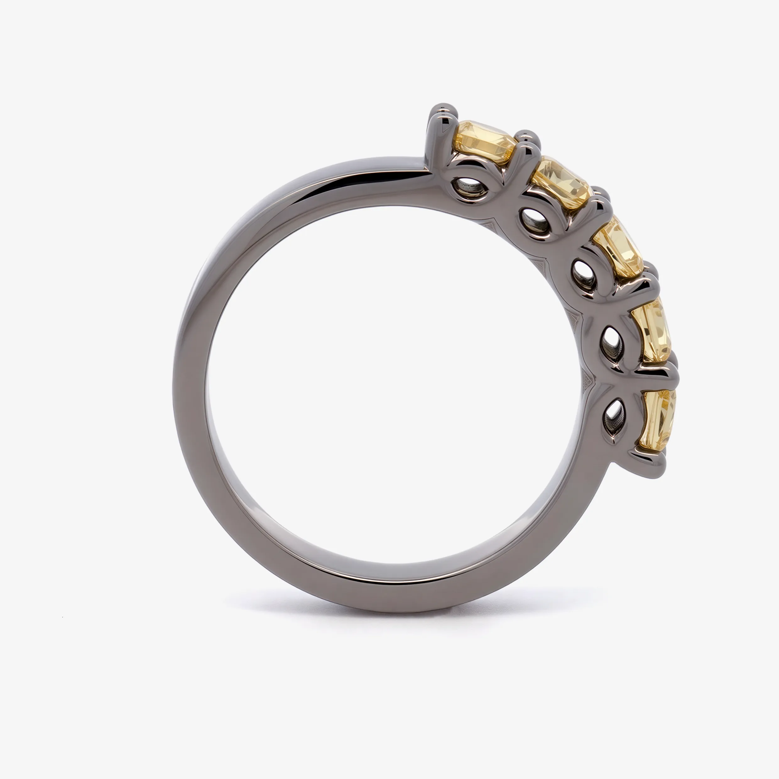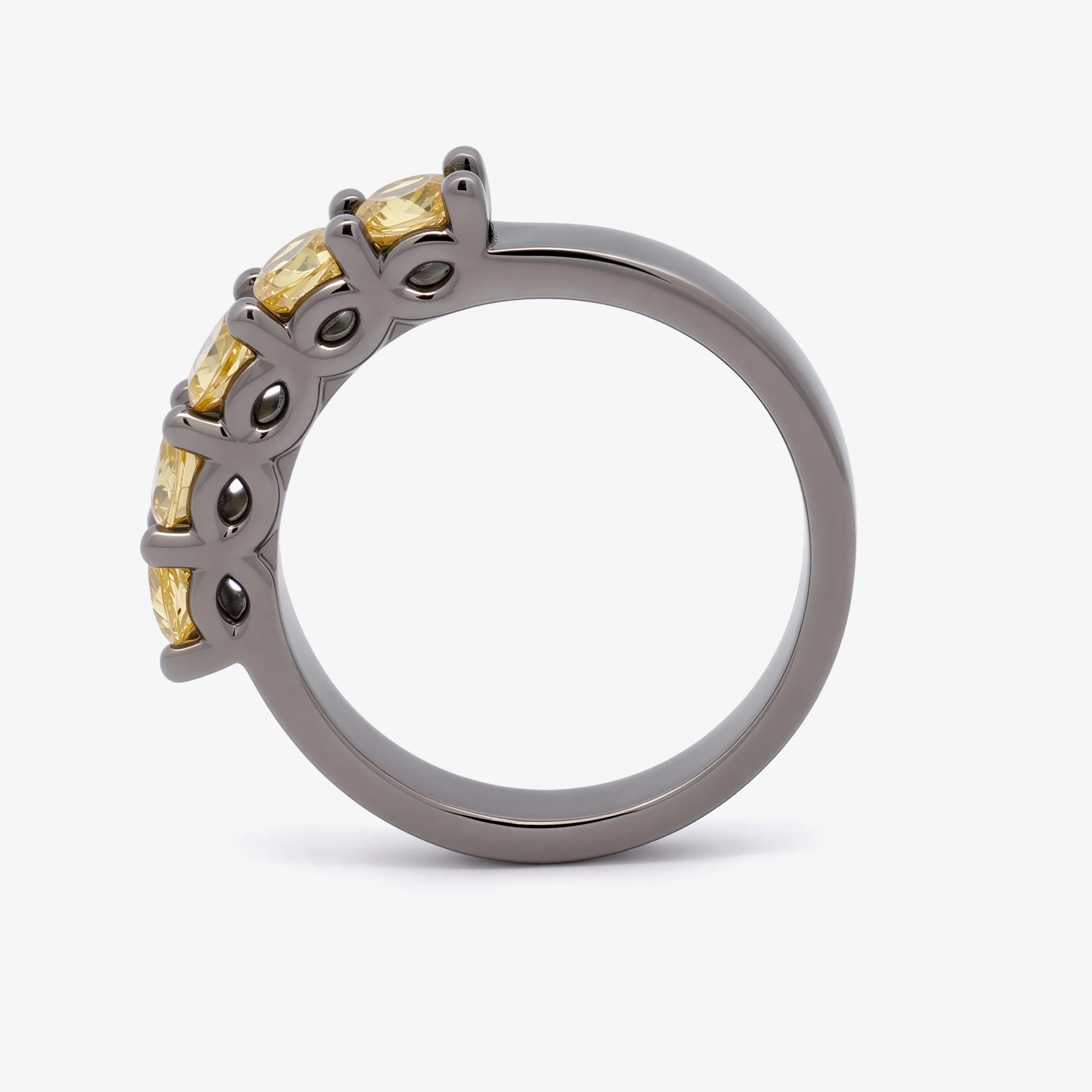 Elevate your style with this radiant multistone ring, expertly crafted in lustrous ruthenium. This ring features a series of round brilliant cut sapphire, each displaying a captivating yellow. A sophisticated piece offering a harmonious blend of warmth and brilliance.