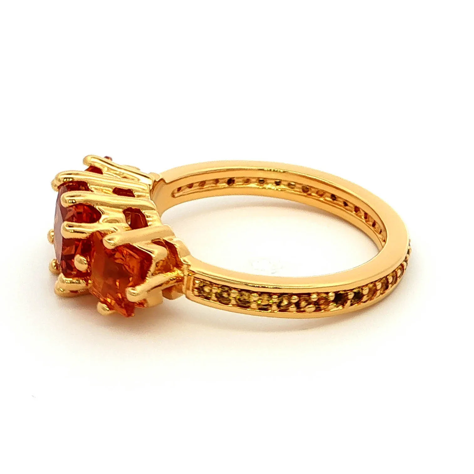 Make a statement with this exquisite multistone ring featuring three captivating square step cut citrines, each radiating a warm orange hue. The citrines are set in a lustrous yellow gold band, enhancing the gemstones’ brilliance and adding a touch of timeless elegance to this beautifully crafted ring.