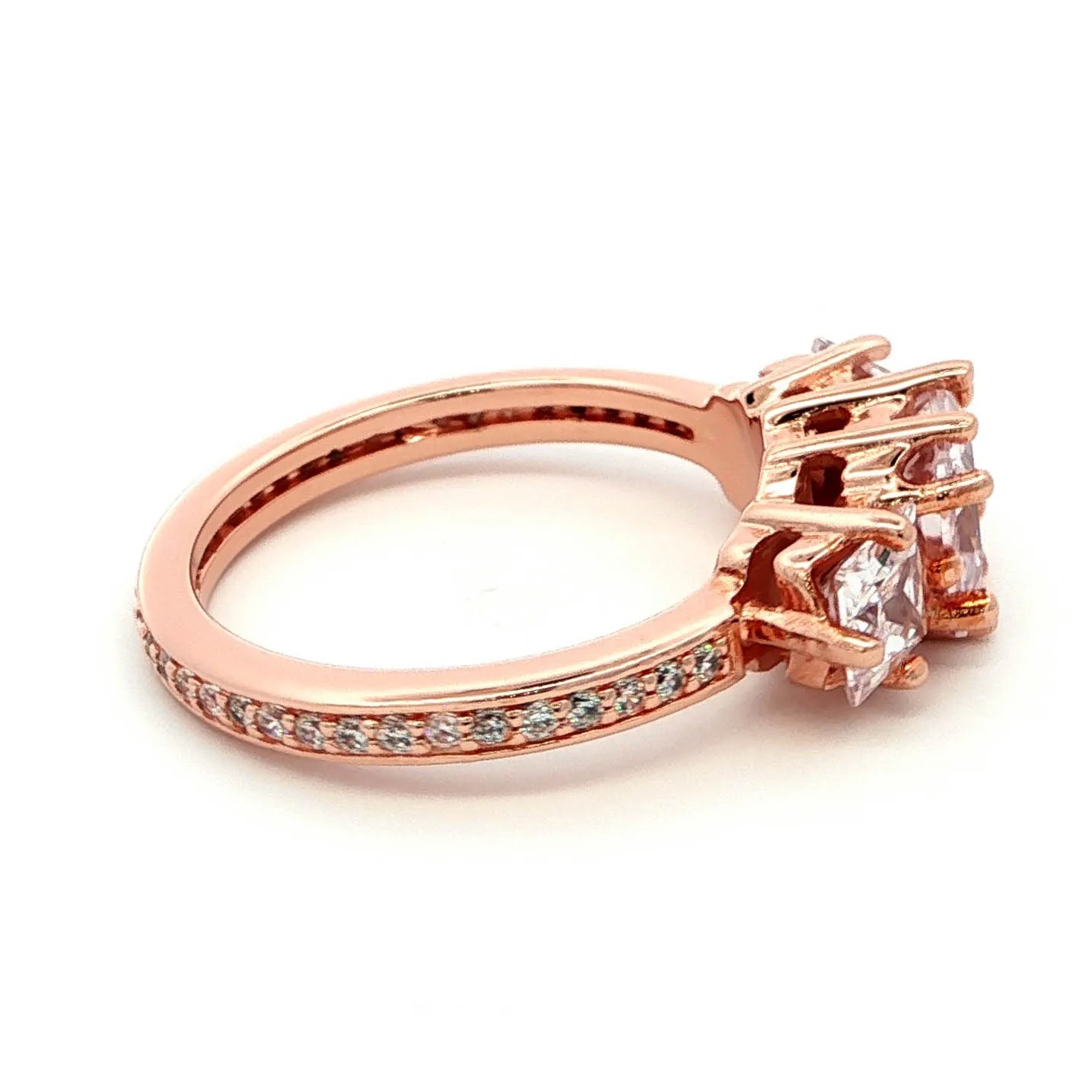 Embrace timeless elegance with this stunning multi-stone ring. Featuring a trio of princess-cut diamonds set in a warm rose gold band, this ring offers a classic yet contemporary appeal. The diamonds, known for their brilliant cutting style, are securely nestled within the precious metal, promising both beauty and durability.