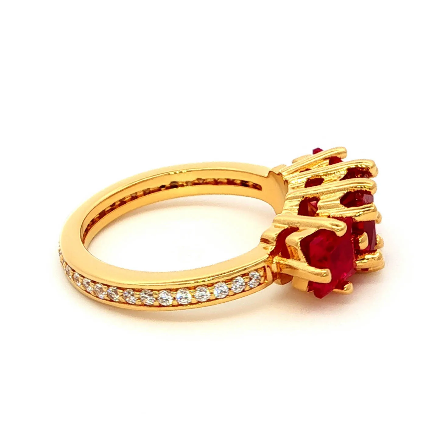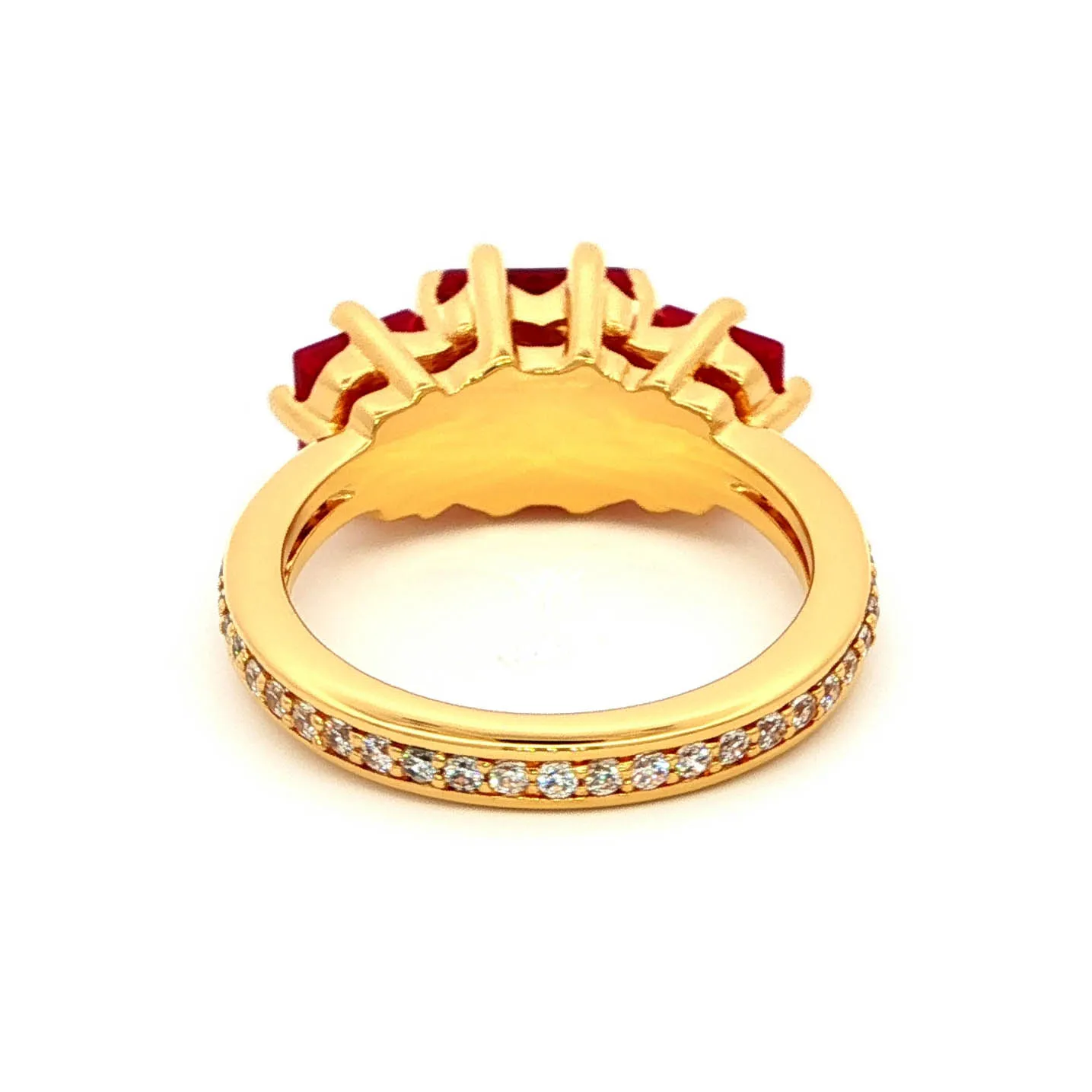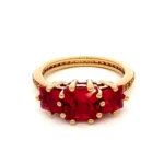 Exquisitely crafted, this rose gold ring showcases a trio of vibrant, square-cut rubies, each boasting a mixed cut to amplify its fiery red hue. The classic multi-stone design adds a touch of timeless elegance, creating a mesmerizing piece perfect for adding a bold statement to any ensemble.