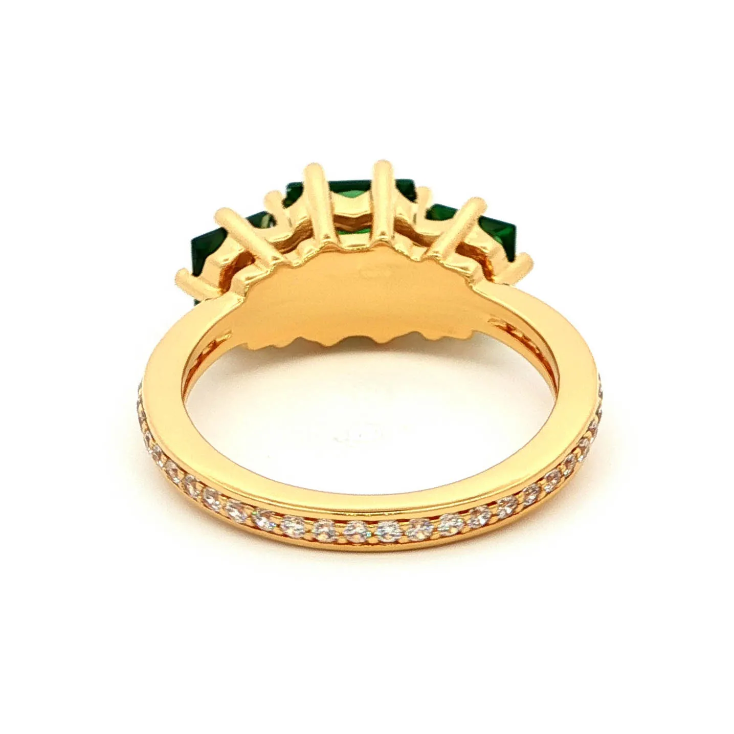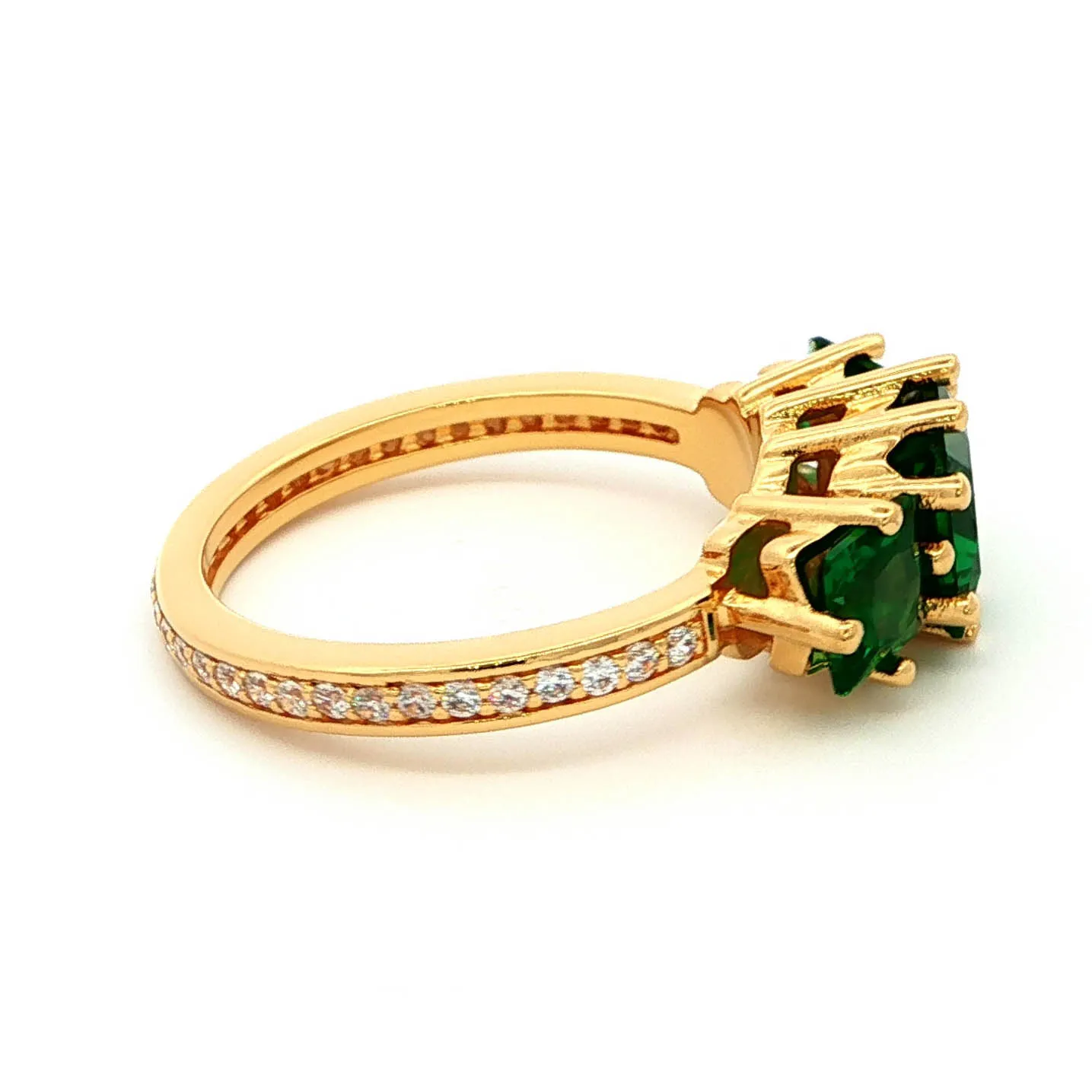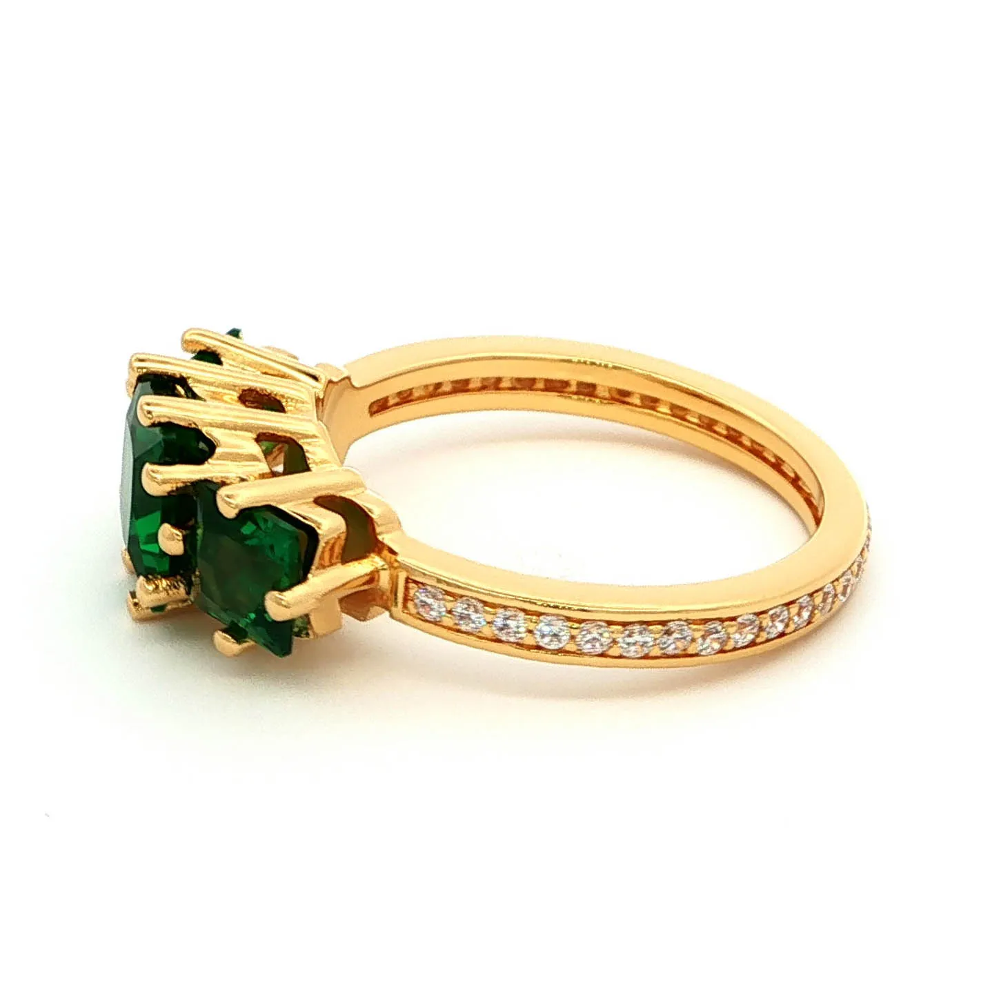 Elevate your style with this exquisite three-stone ring, featuring captivating emerald-cut emeralds set in a lustrous yellow gold band. The emeralds showcase a rich, verdant hue, complemented by the warm tones of the gold, creating a harmonious and timeless design. Perfect for adding a touch of sophistication to any ensemble.