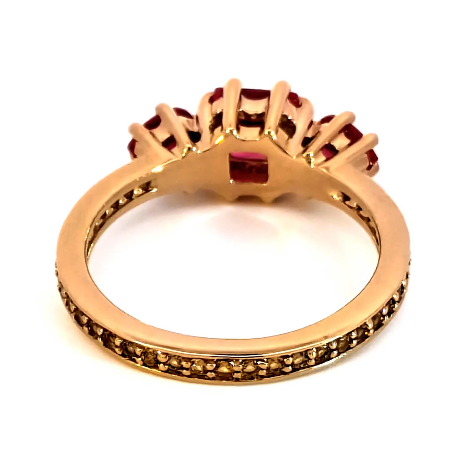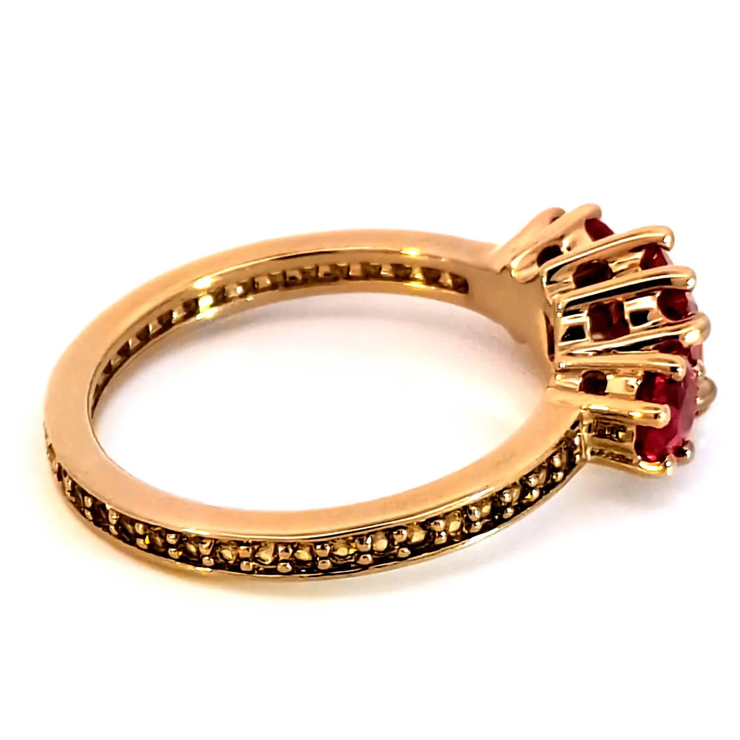 Indulge in the allure of this rose gold multistone ring, showcasing three square-shaped rubies. Each ruby features a mixed cutting style, offering a mesmerizing interplay of light. The rich red hues exude sophistication, perfect for adding a touch of timeless elegance to any ensemble.