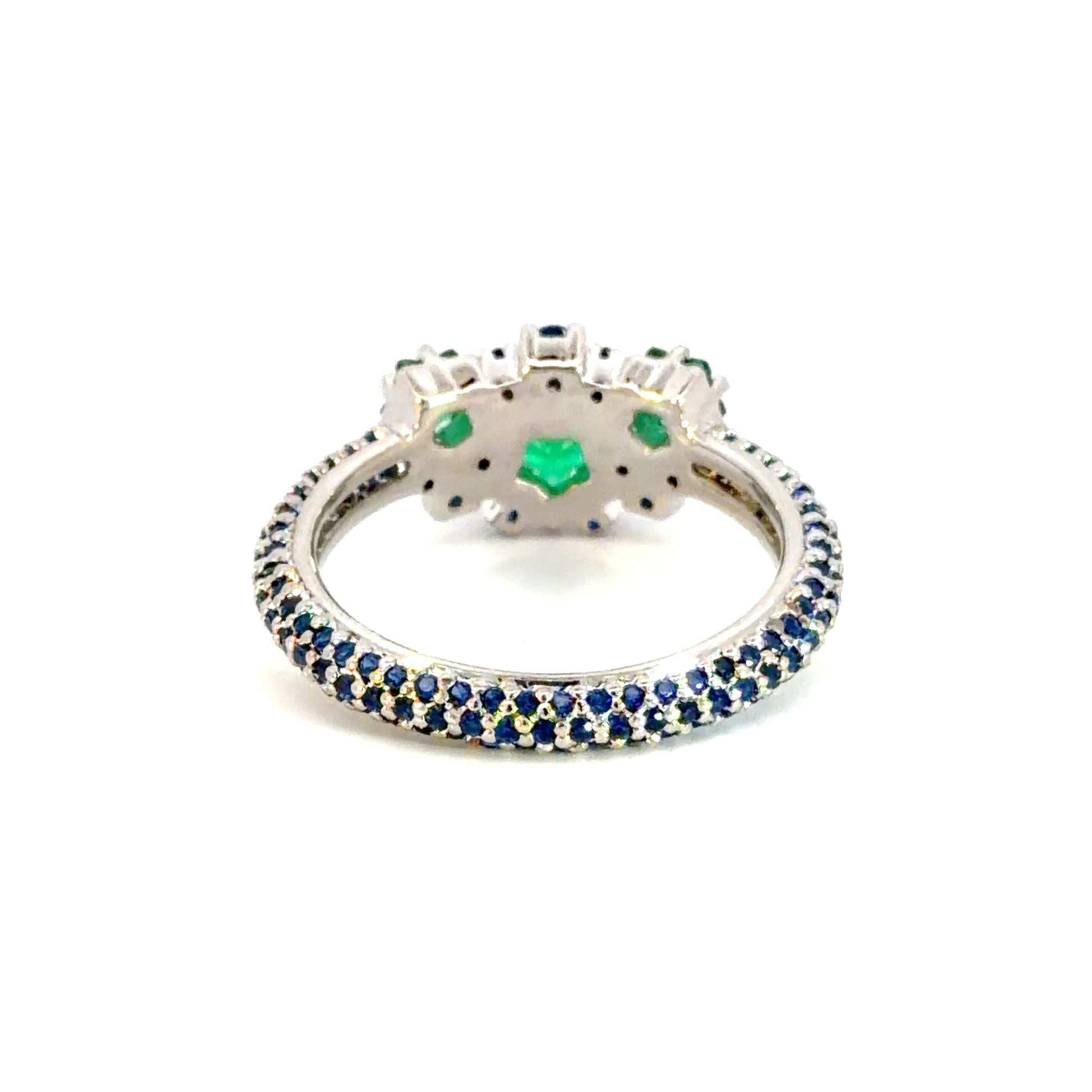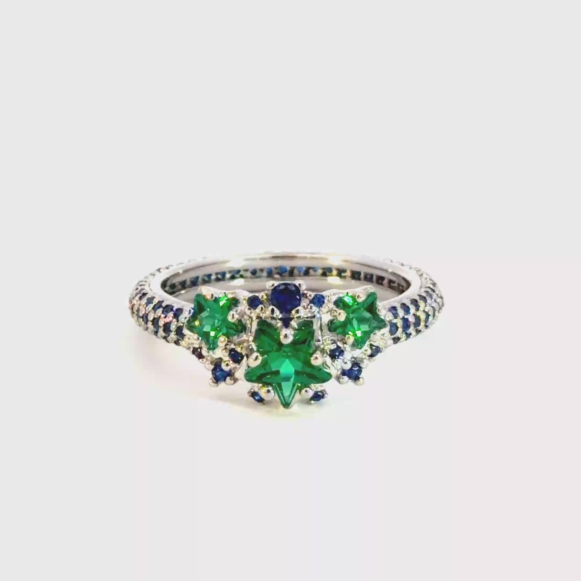 Elevate your ensemble with this stunning multistone ring, crafted from lustrous silver and finished with a radiant white gold plating. The ring showcases a mesmerizing star shaped emerald as the focal point, meticulously cut and polished to reveal its vivid green hue and exceptional clarity. The surrounding stones add depth and dimension to the design, creating a captivating piece.