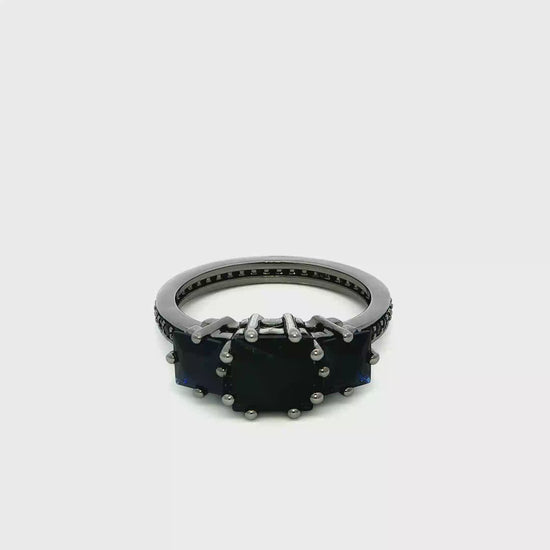 Make a bold statement with this multi-stone ring, featuring a trio of square cabochon-cut onyx gemstones. The sleek, dark metal band complements the deep black hue of the onyx, creating a striking contrast. A unique piece for those who appreciate distinctive design.