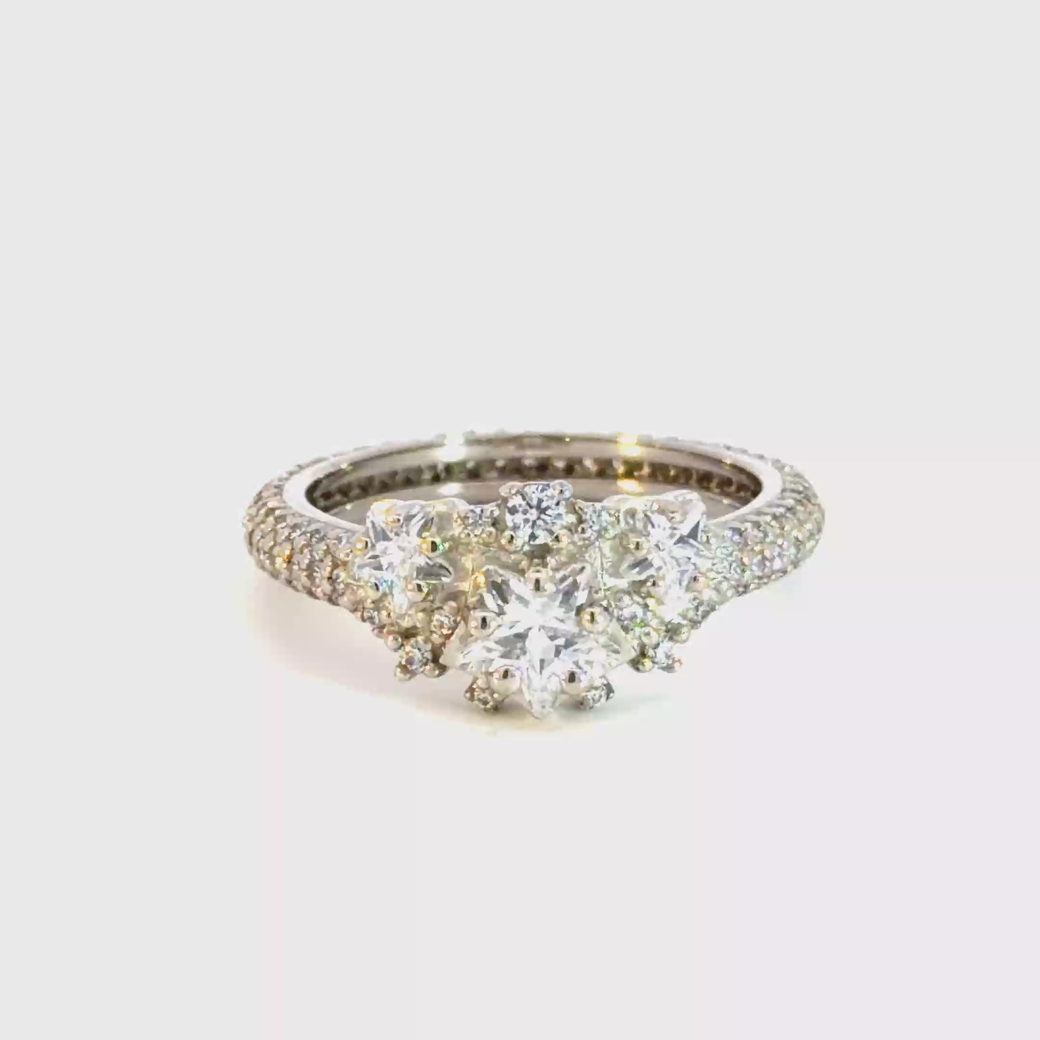 Exquisite multistone ring, meticulously crafted in platinum and adorned with a brilliant arrangement of round cut diamonds. The classic white gold setting enhances the fire and scintillation of each diamond, creating a mesmerizing display of light and luxury. A timeless testament to enduring style.