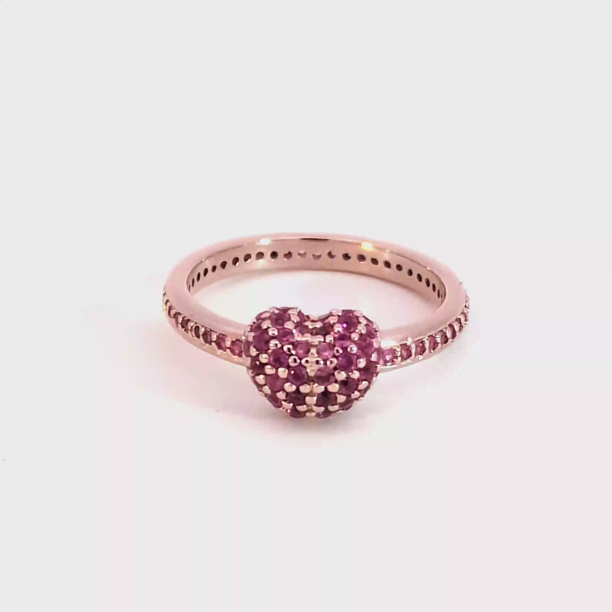 Embrace the allure of this rose gold multistone ring. The design features a heart motif, pavé-set with round, brilliant-cut rubies displaying a captivating reddish purple hue. Crafted in a warm rose gold setting, the meticulous craftsmanship and brilliant design makes this ring a timeless statement piece, perfect for adding a touch of elegance to any ensemble.