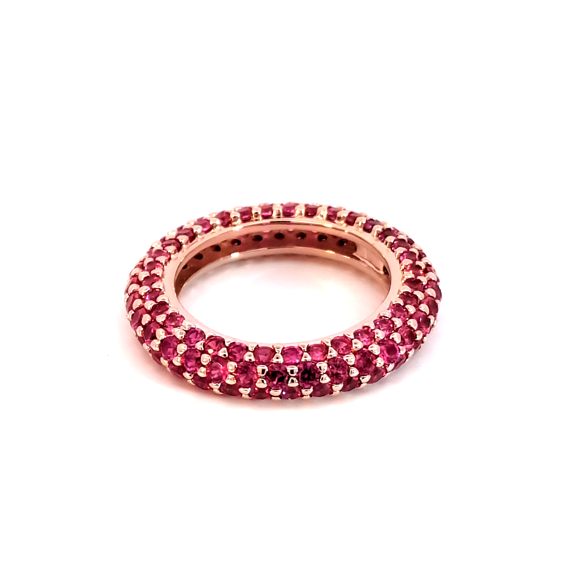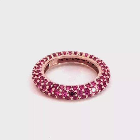 Embrace timeless elegance with this exquisite ruby eternity ring, crafted in lustrous rose gold. The ring features a continuous array of round cut brilliant rubies, their deep red hues evoking passion and sophistication. A symbol of everlasting love, this ring radiates warmth and luxury, making it a perfect heirloom piece or cherished gift. Its continuous design represents unending devotion and timeless style.