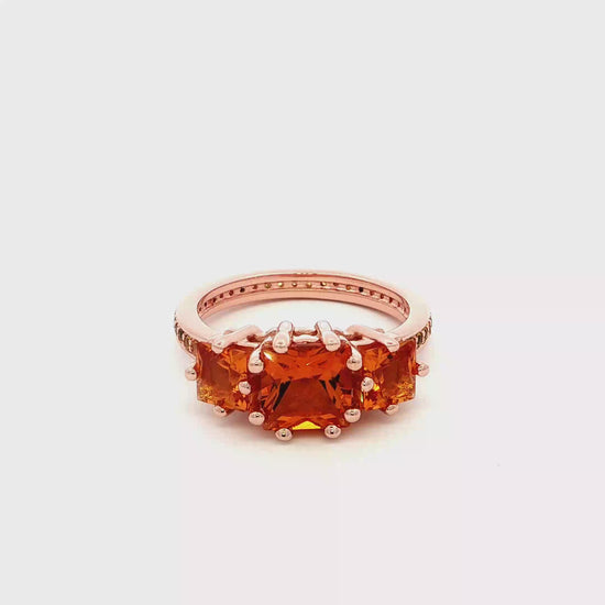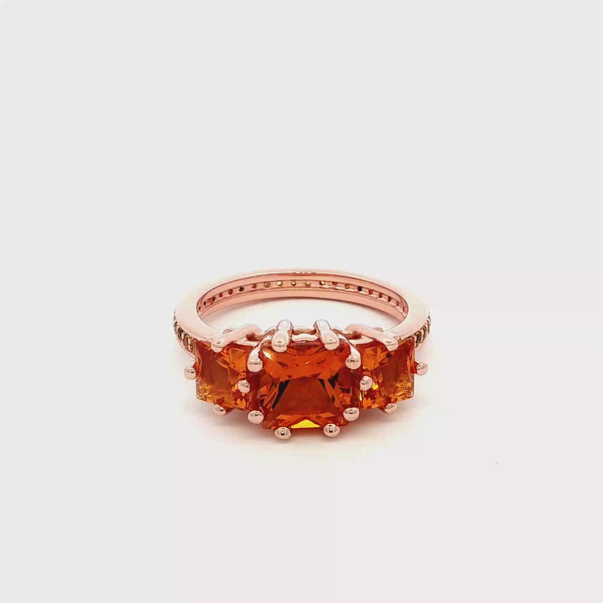 Exquisite rose gold multistone ring featuring three square-cut, transparent citrines. These brilliant-cut citrines showcase a vivid orange hue and are carefully set, adding a touch of warmth and sophistication to any ensemble. Perfect for adding a vibrant pop of color and elegance.