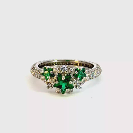 This stunning silver multistone ring showcases a vibrant composition of star-shaped emeralds. Expertly crafted with a mixed cut, these transparent emeralds exhibit a vivid green hue. The ring's design balances elegance with a modern flair, perfect for adding a touch of sophistication to any ensemble.