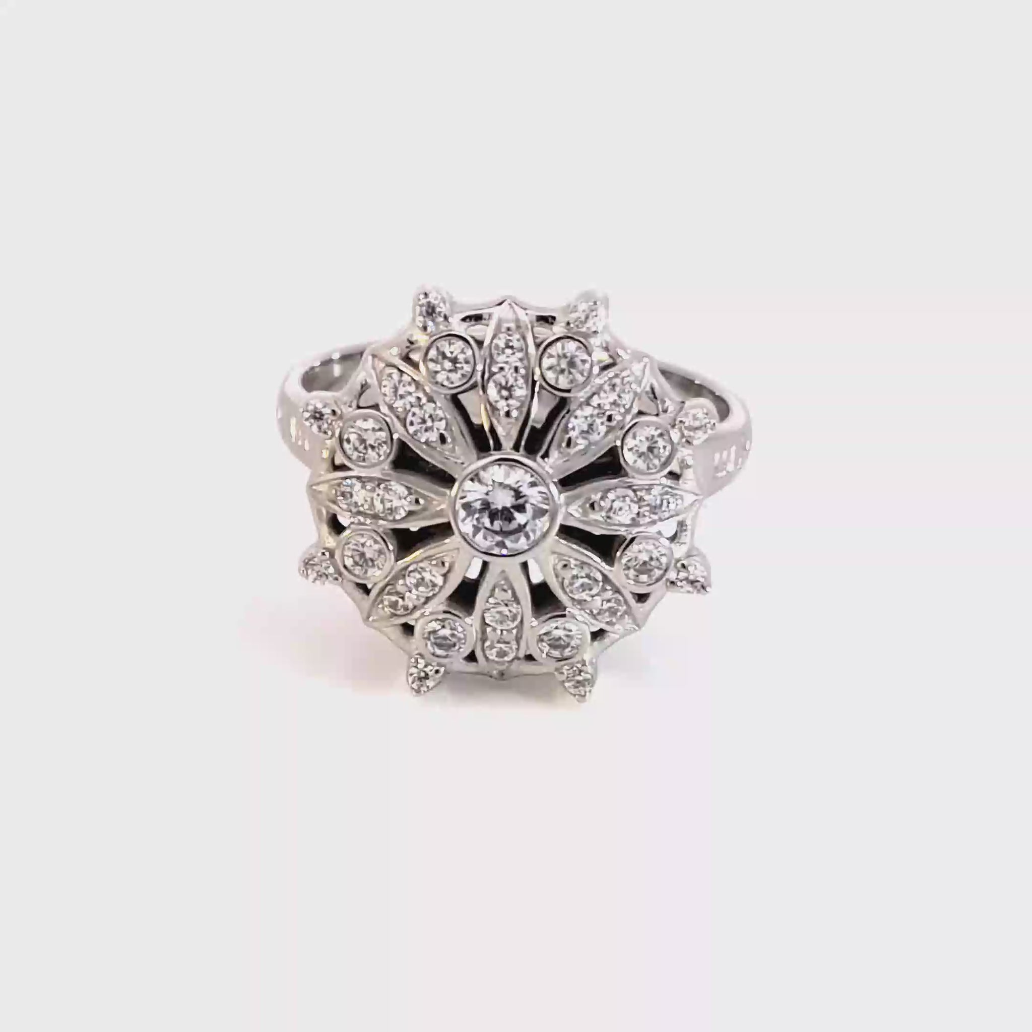 This eye-catching multistone ring, crafted in white gold over silver, features a central round cut diamond surrounded by a halo of smaller brilliant cut diamonds. The design creates a snowflake appearance with exquisite sparkle, suitable for any elegant occasion. A timeless piece showcasing sophistication and refined taste.