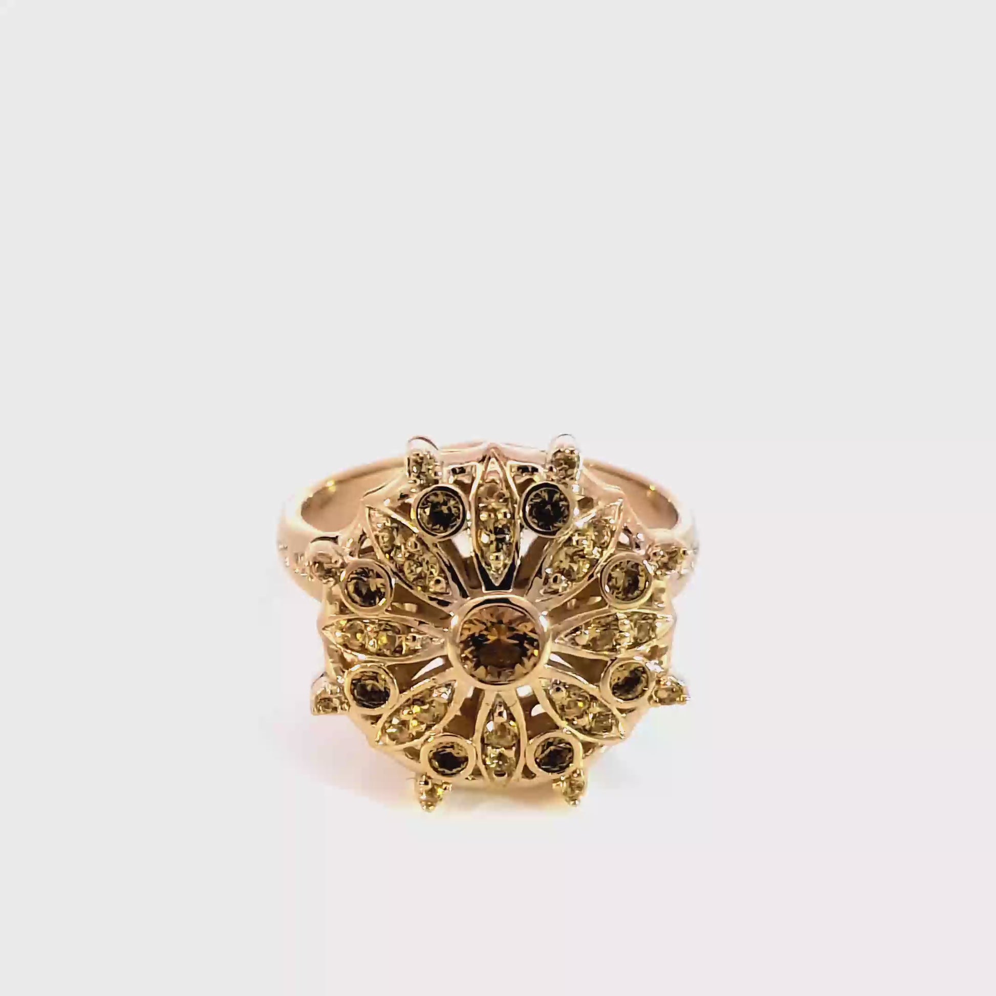 Exude radiant charm with this cocktail ring. Crafted in yellow gold, the ring features a round brilliant-cut citrine. The ring showcases an elaborate, flower-like design, perfectly merging vintage elegance with modern flair. Its distinct structure and mesmerizing citrine create a statement of sophisticated style.