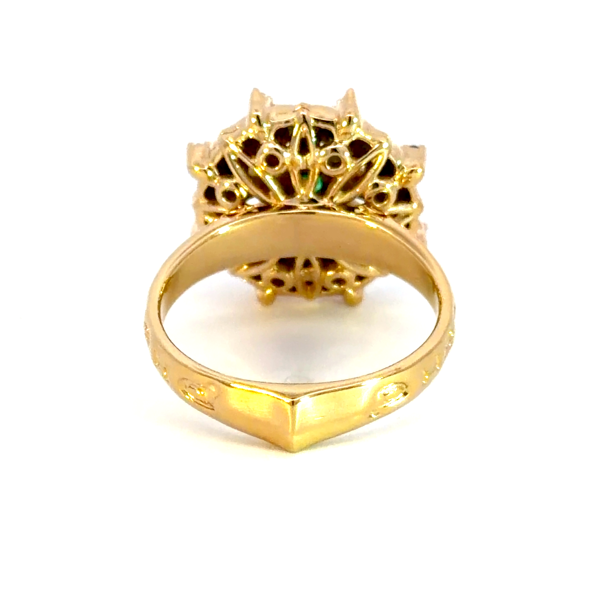 Exquisite yellow gold cocktail ring featuring a centrally set round brilliant cut emerald. The emerald exhibits a rich green hue. This statement piece offers a harmonious balance of vintage charm and timeless elegance, ideal for adding a touch of refined sophistication to any ensemble.