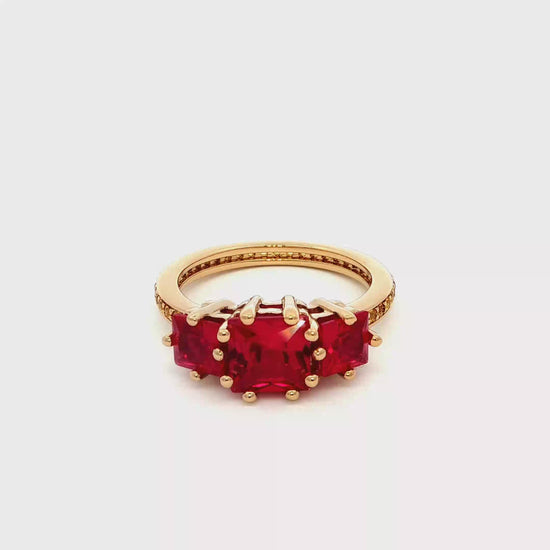 Enchant with this exquisite multistone ring featuring three emerald cut, step cut rubies, each exhibiting a rich red hue. The warm yellow gold setting complements the fiery brilliance of the gemstones, enhancing their vibrant allure. This elegant ring is a timeless testament to sophisticated style and enduring passion.